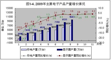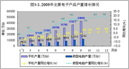 2009年,中國大陸電子信息產業的回暖,還可以從主要電子產品產量的增長情況來驗證。今年1~9月份,手機產量增長率從負的11.2%,回升到9月份的-0.3%,回升了10.9個百分點。