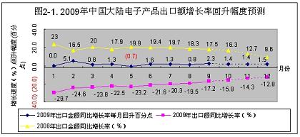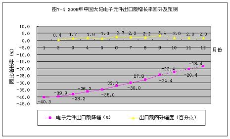 2009年1~9月份,中國大陸電子組件出口額增長率從元月份的-40.3%,回升到9月份的-24.4%。回升了15.9個百分點。按此回升速度計算,到今年年底,可回升到-18.4%(見圖7-4)。