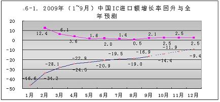 今年1~9月份,中國大陸進口集成電路的降幅不斷回升,從元月份的-46.6%,回升到9月份的-16.9%。共回升了29.7個百分點。按此回升速度,到今年年底可回升到-9.4%(見圖6-1)。