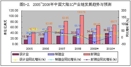據中國半導體行業協會統計,今年1~9月份IC設計業、製造業和封裝業的銷售收入分別比2008年增長10.2%、-25.4%和-37.2%,製造業和封裝業下降幅度較大。預計2010年會隨著國內經濟和出口形勢的好轉,將逐步回升到小幅度正增長(見圖5-1、5-2)。