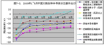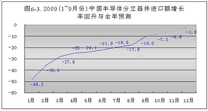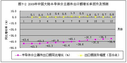 2009年1~9月份,中國大陸半導體分立器件出口額增長率從元月份的-43.4%,回升到9月份的-37.7%。隻回升了5.7個百分點。按此回升速度計算,到今年年底,隻能回升到-35.5%,預計2010年會有所好轉(見圖7-2)。
