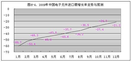 今年元月份,電子組件進口額增長率跌幅最大,達到-60.7%。回升速度也慢。到9月份回升到-30.5%,共回升了30.2個百分點。按此回升速度,到今年年底可回升到-21.2%(見圖6-4)。所以今年電子組件進口額呈現負增長已成定局。其主要原因,除整機出口的影響外,是近幾年國內電子組件供應份額的不斷擴大。
