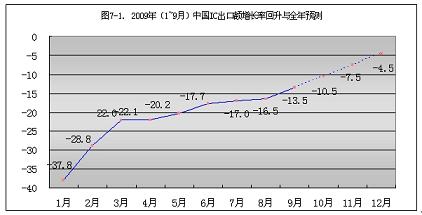 2009年1~9月份,中國大陸IC出口額的增長率從元月份的-37.8%,回升到9月份的-13.5%。回升了24.3個百分點。按此回升速度計算,到今年年底,可回升到-4.5%(見圖7-1)。