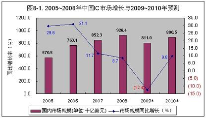 2009年,受國際金融危機影響,電子產品出口受阻,整機產量有所下降,國內集成電路的需求規模,同2008年相比將下降12.4%,約為811億美元(見圖8-1)。其中,90%左右仍靠進口。