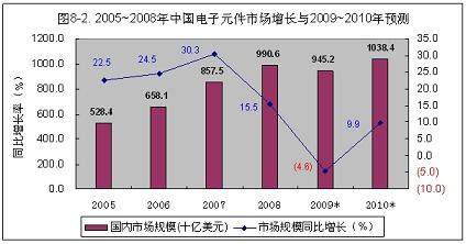 2009年,國內電子組件市場需求規模,同2008年相比將下降4.6%,約為945.2億美元(見圖8-2)。其中,60%左右仍靠進口。