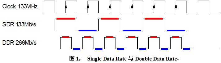 內存技術從SDR,DDR,DDR2,DDR3一路發展而來,傳輸速度以指數遞增,除了晶圓製造工藝的提升因素之外,還因為采用了Double Data Rate以及Prefetch兩項技術。實際上,無論是SDR還是DDR或DDR2、3,內存芯片內部的核心時鍾基本上是保持一致的,都是100MHz到200MHz(某些廠商生產的超頻內存除外)。DDR即Double Data Rate技術使數據傳輸速度較SDR提升了一倍。如下圖所示,SDR僅在時鍾的上升沿傳輸數據,而DDR在時鍾信號上、下沿同時傳輸數據。例如同為133MHz時鍾,DDR卻可以達到266Mb/s的數傳速度。