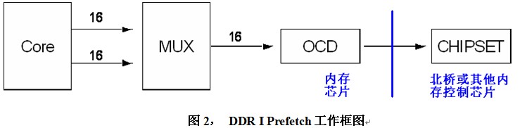 Double Data Rate技術使數據外傳速度提升了一倍,而芯片內部數據數據傳輸速度的提升則是通過Prefetch技術實現的。所謂Prefetch簡單的說就是在一個內核時鍾周期同時尋址多個存儲單元並將這些數據以並行的方式統一傳輸到IO Buffer中,之後以更高的外傳速度將IO Buffer中的數據傳輸出去。這個更高的速度在DDR I上就是通過Double Data Rate實現的,也正因為如此,DDR I外部Clock管腳的頻率與芯片內部的核心頻率是保持一致的。如下圖所示為DDR I 的Prefetch過程中,在16位的內存芯片中一次將2個16bit數據從內核傳輸到外部MUX單元,之後分別在Clock信號的上、下沿分兩次將這2 x 16bit數據傳輸給北橋或其他內存控製器,整個過程經曆的時間恰好為一個內核時鍾周期。