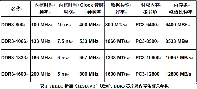 下表列出了JEDEC標準(JESD79-3)規定的DDR3芯片及內存條相關參數。需要說明的是,如前所述,並不是所有的內存產品都完全遵從JEDEC標準,有些廠商會生產速度更高速的DDR3芯片,一般情況下這些芯片是從芯片檢測流程中篩選出來的頻率動態範圍更大的芯片,或者是可加壓超頻工作的芯片。