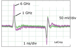 隨sui著zhe脈mai衝chong信xin號hao上shang升sheng沿yan的de加jia快kuai,信xin號hao所suo包bao含han的de諧xie波bo成cheng分fen也ye越yue來lai越yue豐feng富fu。對dui於yu同tong一yi個ge脈mai衝chong信xin號hao,使shi用yong不bu同tong帶dai寬kuan的de示shi波bo器qi所suo測ce量liang出chu的de結jie果guo可ke能neng是shi不bu同tong的de。例li如ru,下xia圖tu一yi所suo示shi的de脈mai衝chong測ce量liang中zhong,使shi用yong1G帶寬的示波器測量到的脈衝幅度僅為使用6G示波器測量值的一半。
