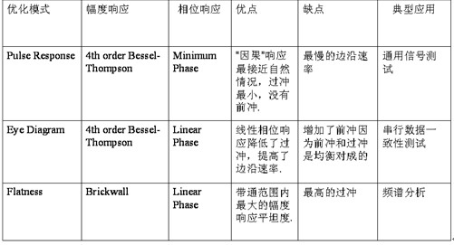 如(ru)圖(tu)五(wu)所(suo)示(shi),每(mei)種(zhong)脈(mai)衝(chong)響(xiang)應(ying)方(fang)式(shi)均(jun)由(you)不(bu)同(tong)的(de)幅(fu)頻(pin)響(xiang)應(ying)及(ji)相(xiang)頻(pin)響(xiang)應(ying)方(fang)式(shi)組(zu)合(he)而(er)來(lai),對(dui)同(tong)樣(yang)的(de)階(jie)躍(yue)脈(mai)衝(chong)信(xin)號(hao),不(bu)同(tong)的(de)響(xiang)應(ying)方(fang)式(shi)將(jiang)恢(hui)複(fu)出(chu)不(bu)同(tong)的(de)信(xin)號(hao)波(bo)形(xing)。例(li)如(ru),采(cai)用(yong)Pulse Mode恢複出的波形與模擬示波器的測量效果最為接近,因為其采用的幅頻響應更為平緩,同時其相頻響應也是因果有界的;采用Flatness Mode恢複出的波形其上升時間最短,但波形中同時包含了更多的過衝成分。這zhe三san種zhong脈mai衝chong響xiang應ying方fang式shi不bu存cun在zai哪na個ge更geng好hao的de問wen題ti,而er是shi分fen別bie適shi應ying了le不bu同tong信xin號hao的de測ce試shi應ying用yong需xu求qiu。下xia表biao總zong結jie了le三san種zhong脈mai衝chong響xiang應ying方fang式shi的de不bu同tong特te點dian及ji其qi各ge自zi適shi用yong的de領ling域yu。
