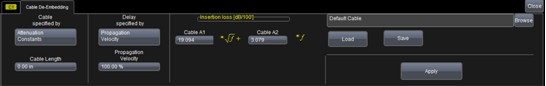 在使用示波器結合同軸電纜測量脈衝信號時,為保證測量的精確性與一致性,必須去除電纜的效應。力科WaveMaster8Zi係列示波器擁有電纜去嵌(cable de-embedding)功能,在每個通道中均可選擇是否激活此功能(下圖所示為cable de-embedding的操作界麵)。可以使用兩種方法來輸入電纜的特性:一種是電纜的衰減常數,包括了電纜長度、傳輸速度、插入損耗的多項式係數;另一種是直接輸入多個頻率點的插入損耗(即S參數的S21)。電纜的特性參數可以從電纜廠商處獲得,或者使用TDR或矢量網絡分析儀測量。