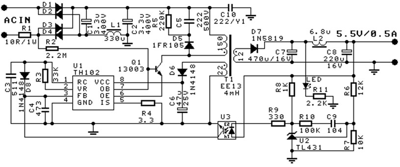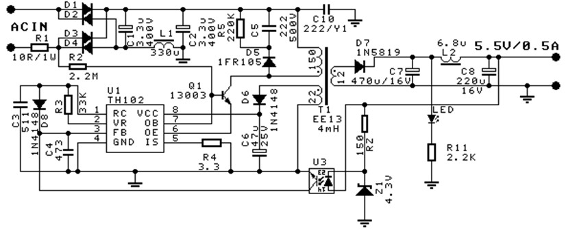 TH102零負載功耗包括:高壓啟動電阻(圖2、圖3中R2)靜態功耗,約30mW左右;開關功率管開關損耗;磁複位損耗,圖2、圖3采用RCD電路(圖中R5、C5、D5)損耗較大,若采用齊納二極管磁複位電路能降低損耗,但成本較高;開關變壓器開關損耗;TH102工作損耗;和輸出反饋損耗;按圖2、圖3方案,零負載功耗小於0.3W,圖中D8在零負載和小負載時將增大開關周期,減小開關功率管開關損耗。