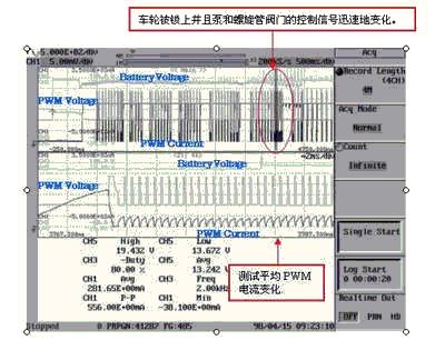 接著再次迅速提高盤式液壓,通過ABS傳chuan動dong裝zhuang置zhi增zeng加jia製zhi動dong力li。換huan句ju話hua說shuo,可ke通tong過guo增zeng減jian盤pan式shi液ye壓ya防fang止zhi製zhi動dong器qi被bei鎖suo上shang。增zeng加jia盤pan式shi液ye壓ya也ye就jiu是shi用yong泵beng將jiang液ye體ti壓ya入ru汽qi缸gang,會hui使shi泵beng馬ma達da迅xun速su工gong作zuo。這zhe個ge快kuai速su的de馬ma達da將jiang影ying響xiang控kong製zhi螺luo旋xuan管guan閥fa門men的dePWM電流信號。一般ABS操作無法得到這是否影響電池電壓波動。因此,有必要觀察這個電池電壓波動。