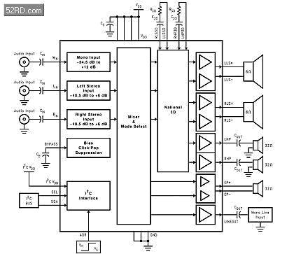 ●後級放大器:包括一立體聲揚聲器(喇叭)驅動器,一立體聲耳機驅動器,一單聲道耳機放大器(earpiece),和一用於免持聽筒之線路輸出(lineout),例如汽車的免持聽筒電話輸出。