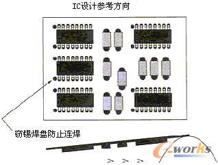 PCB上元器件的布局對生產效率和成本有相當重要的影響,是衡量PCB設計的可裝聯性的重要指標。一般來講,元器件盡可能均勻地、有規則地、整齊排列,並按相同方向、極性分布排列。有規則的排列方便檢查,有利於提高貼片/插件速度,均勻分布利於散熱和焊接工藝的優化。另一方麵,為簡化工藝流程,PCB設計者始終都要清楚,在PCB的任一麵,隻能采用回流焊接和波峰焊接中的一種群焊工藝。這點在組裝密度較大、PCB的de焊han接jie麵mian必bi須xu分fen布bu較jiao多duo貼tie片pian元yuan器qi件jian時shi,尤you其qi值zhi得de注zhu意yi。設she計ji者zhe要yao考kao慮lv對dui焊han接jie麵mian上shang的de貼tie裝zhuang元yuan件jian使shi用yong何he種zhong群qun焊han工gong藝yi,最zui為wei優you選xuan的de是shi使shi用yong貼tie片pian固gu化hua後hou的de波bo峰feng焊han工gong藝yi,可ke以yi同tong時shi對dui元yuan件jian麵mian上shang的de穿chuan孔kong器qi件jian的de引yin腳jiao進jin行xing焊han接jie;但波峰焊接貼片元件有相對嚴格的約束,隻能焊接0603及以上尺寸的片式阻容﹑SOT﹑SOIC(引腳間距≥1mm且高度小於2.0mm)。分布在焊接麵的元器件,引腳的方向宜垂直於波峰焊接時PCB的傳送方向,以保證元器件兩邊的焊端或引線同時被浸焊,相鄰元件間的排列次序和間距也應滿足波峰焊接的要求以避免“遮蔽效應”,如圖1。當采用波峰焊接SOIC等多腳元件時,應於錫流方向最後兩個(每邊各1)焊腳處設置竊錫焊盤,防止連焊。