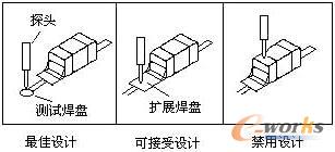圖6所suo示shi為wei測ce試shi點dian設she計ji的de一yi個ge示shi例li。通tong過guo延yan伸shen線xian在zai元yuan器qi件jian引yin線xian附fu近jin設she置zhi測ce試shi焊han盤pan或huo利li用yong過guo孔kong焊han盤pan測ce試shi節jie點dian,測ce試shi節jie點dian嚴yan禁jin選xuan在zai元yuan器qi件jian的de焊han點dian上shang,這zhe種zhong測ce試shi可ke能neng使shi虛xu焊han節jie點dian在zai探tan針zhen壓ya力li作zuo用yong下xia擠ji壓ya到dao理li想xiang位wei置zhi,從cong而er使shi虛xu焊han故gu障zhang被bei掩yan蓋gai,發fa生sheng所suo謂wei的de“故障遮蔽效應”。由於探針因定位誤差引起的偏晃,可能使探針直接作用於元器件的端點或引腳上而造成元器件損壞。