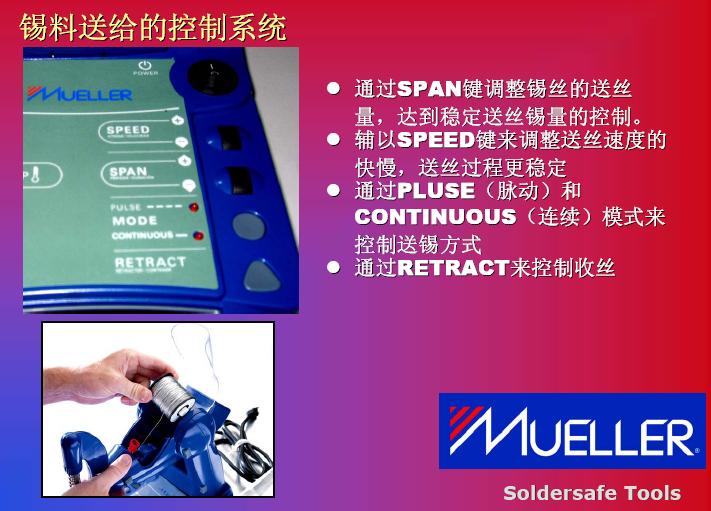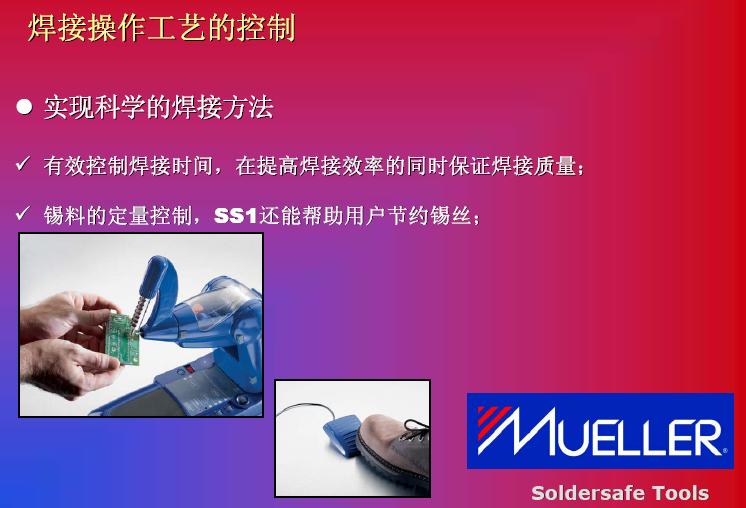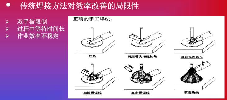 在發熱功率方麵的提高,我們碰到另外一個問題。我們也可以看到951和937,還hai有you新xin推tui出chu來lai機ji器qi,我wo們men將jiang發fa熱re功gong率lv進jin行xing對dui比bi。他ta們men也ye花hua了le很hen多duo研yan發fa精jing力li來lai提ti高gao發fa熱re功gong率lv,如ru果guo在zai提ti高gao發fa熱re功gong率lv之zhi後hou,確que實shi能neng提ti高gao生sheng產chan效xiao率lv,但dan是shi它ta是shi不bu是shi可ke以yi被bei無wu限xian製zhi提ti升sheng呢ne?現xian在zai的de機ji器qi比bi如ru到dao150瓦到160瓦,已經上升了3倍,是否還會提高到4倍,這一個效率的提高導致整體效率的提高,我個人不是很讚同。其實這是比較係統性的解決方案,我們看到MUELLER是(shi)通(tong)過(guo)對(dui)工(gong)藝(yi)改(gai)進(jin)達(da)到(dao)更(geng)高(gao)的(de)焊(han)接(jie)效(xiao)率(lv)。在(zai)談(tan)到(dao)這(zhe)款(kuan)機(ji)器(qi)之(zhi)前(qian),我(wo)們(men)回(hui)顧(gu)一(yi)下(xia)傳(chuan)統(tong)焊(han)接(jie)方(fang)法(fa)作(zuo)業(ye)的(de)特(te)點(dian),我(wo)們(men)的(de)圖(tu)從(cong)左(zuo)到(dao)右(you)看(kan),整(zheng)個(ge)工(gong)藝(yi)從(cong)加(jia)熱(re)到(dao)預(yu)熱(re),再(zai)繼(ji)續(xu)加(jia)熱(re),第(di)四(si)步(bu)是(shi)添(tian)加(jia)焊(han)心(xin),然(ran)後(hou)取(qu)走(zou)焊(han)嘴(zui),這(zhe)是(shi)非(fei)常(chang)傳(chuan)統(tong)的(de)焊(han)接(jie)工(gong)藝(yi),反(fan)過(guo)來(lai)看(kan),我(wo)們(men)看(kan)到(dao)整(zheng)個(ge)焊(han)接(jie)過(guo)程(cheng)中(zhong),雙(shuang)手(shou)是(shi)被(bei)限(xian)製(zhi)的(de)。從(cong)第(di)二(er)張(zhang)圖(tu)開(kai)始(shi),都(dou)是(shi)靠(kao)手(shou)去(qu)拿(na),關(guan)鍵(jian)是(shi)控(kong)製(zhi)在(zai)雙(shuang)手(shou)被(bei)占(zhan)用(yong)。過(guo)程(cheng)等(deng)待(dai)時(shi)間(jian)會(hui)很(hen)長(chang),我(wo)們(men)可(ke)以(yi)看(kan)到(dao)實(shi)際(ji)作(zuo)業(ye)過(guo)程(cheng)中(zhong)下(xia)麵(mian)三(san)步(bu)是(shi)真(zhen)正(zheng)起(qi)到(dao)作(zuo)用(yong),前(qian)麵(mian)預(yu)熱(re)當(dang)然(ran)是(shi)準(zhun)備(bei)工(gong)作(zuo),但(dan)是(shi)在(zai)這(zhe)個(ge)工(gong)作(zuo)中(zhong),我(wo)們(men)雙(shuang)手(shou)等(deng)待(dai)的(de)時(shi)間(jian)會(hui)非(fei)常(chang)長(chang)。第(di)三(san)個(ge),作(zuo)業(ye)效(xiao)率(lv)不(bu)是(shi)特(te)別(bie)穩(wen)定(ding),因(yin)為(wei)我(wo)們(men)送(song)錫(xi)的(de)時(shi)候(hou),以(yi)及(ji)拿(na)走(zou)錫(xi)絲(si)過(guo)程(cheng)中(zhong)依(yi)賴(lai)員(yuan)工(gong)本(ben)身(shen)的(de)技(ji)巧(qiao)和(he)技(ji)術(shu)。