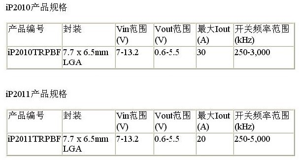 iP2010的輸入電壓範圍為7V至13.2V,輸出電壓範圍則為0.6V至5.5V,輸出電流高達30A。這個器件最高運行頻率為3MHz。在5MHz運行時,與iP2010引腳兼容的iP2011備有相同的輸入和輸出電壓範圍,但後者經過優化,從而使最高輸出電流高達20A。通過以通用占位麵積提供多種電流額定值器件,IR提供的靈活性能夠滿足不同客戶對電流水平、性能和成本的要求。