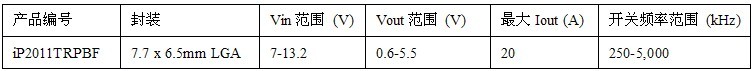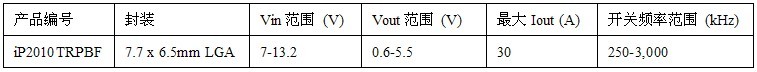 iP2010的輸入電壓範圍為7V至13.2V,輸出電壓範圍則為0.6V至5.5V,輸出電流高達30A。這個器件最高運行頻率為3MHz。在5MHz運行時,與iP2010引腳兼容的iP2011備有相同的輸入和輸出電壓範圍,但後者經過優化,從而使最高輸出電流高達20A。通過以通用占位麵積提供多種電流額定值器件,IR提供的靈活性能夠滿足不同客戶對電流水平、性能和成本的要求。