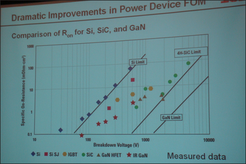 這個采用氮化鉀材料的新器件可以將係統的效率改善3.5%到7%,采用簡單的熱控製即可達到節能效果,在目前綠色節能的大趨勢下可以發揮重要作用。在改善功率器件的優值係數方麵,這個氮化镓 (GaN) 功率器件也表現突出,如下圖所示。