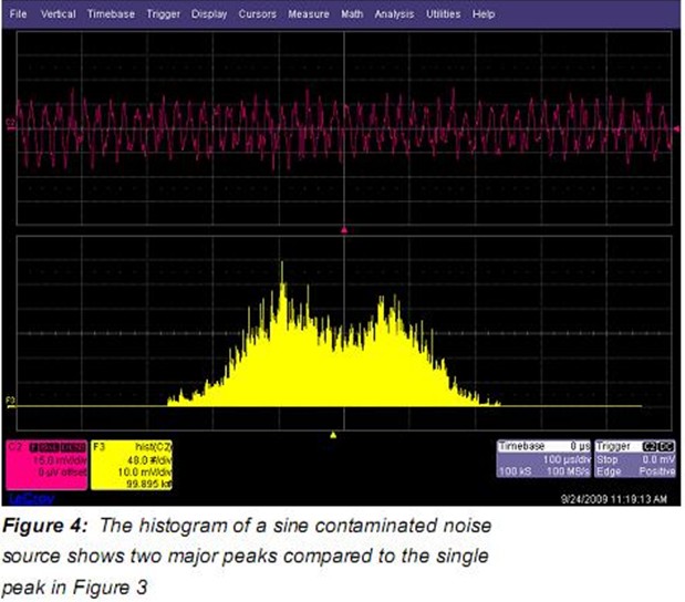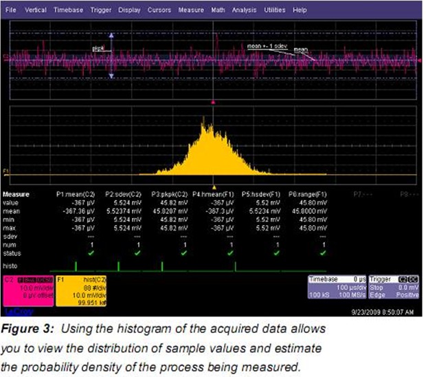 讓我們從大部分基本測量開始。Figure 2中(zhong)我(wo)們(men)做(zuo)了(le)帶(dai)寬(kuan)受(shou)限(xian)噪(zao)聲(sheng)波(bo)形(xing)的(de)時(shi)域(yu)測(ce)量(liang)。通(tong)過(guo)使(shi)用(yong)測(ce)量(liang)參(can)數(shu)取(qu)得(de)了(le)噪(zao)聲(sheng)信(xin)號(hao)特(te)征(zheng)的(de)一(yi)些(xie)認(ren)識(shi)。大(da)多(duo)數(shu)有(you)意(yi)義(yi)的(de)參(can)數(shu)是(shi)波(bo)形(xing)的(de)平(ping)均(jun)值(zhi),標(biao)準(zhun)方(fang)差(cha),峰(feng)峰(feng)值(zhi)。這(zhe)些(xie)測(ce)量(liang)的(de)標(biao)準(zhun)方(fang)差(cha),可(ke)以(yi)描(miao)述(shu)為(wei)交(jiao)流(liu)有(you)效(xiao)值(zhi),被(bei)看(kan)作(zuo)成(cheng)波(bo)形(xing)的(de)有(you)效(xiao)值(zhi)是(shi)非(fei)常(chang)有(you)用(yong)的(de)。參(can)數(shu)統(tong)計(ji)可(ke)顯(xian)示(shi)平(ping)均(jun)值(zhi),最(zui)大(da)值(zhi),最(zui)小(xiao)值(zhi),標(biao)準(zhun)方(fang)差(cha),統(tong)計(ji)的(de)測(ce)量(liang)值(zhi)數(shu)量(liang)。讀(du)出(chu)參(can)數(shu)下(xia)的(de)小(xiao)直(zhi)方(fang)圖(tu)稱(cheng)為(wei)histicons,顯示了相關參數測量值的分布。