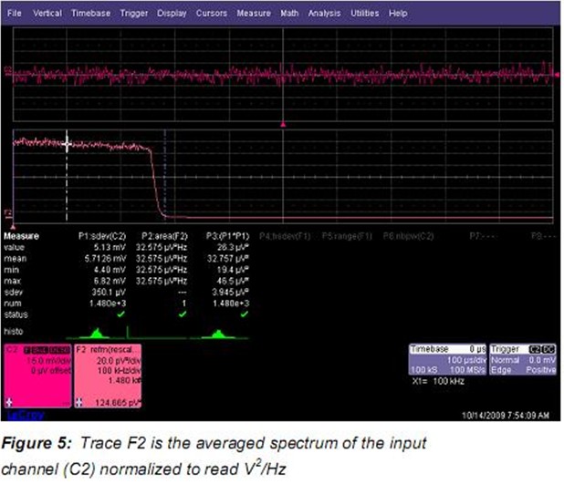 跡線F2中的光標讀數可以直接讀取Figure 5中所示的點功率譜密度。光標設置到100kHz讀數為 124.665pV2√Hz。