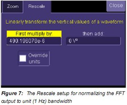 平均FFT輸出要歸一化到等效FFT帶寬。此外,還有其它刻度也要提到。力科示波器的FFT輸出校正到峰值讀數而不是有效值。要轉化為有效值,FFT幅度必須乘以0.707而幅度的平方值要乘以0.5。FFT值除以等效帶寬是為了歸一化到1Hz帶寬。Figure 7中顯示了重標刻度功能。重標刻度功能允許用戶通過乘一個係數重標刻度並增加或減去偏移。該處,乘以 05/102=490 E-6。係數0.5前麵討論過,另一個係數是等效FFT帶寬的倒數,等於∆f乘以如Figure 6中所示的ENBW。如果加權函數不是矩形則ENBW的值將大於1。