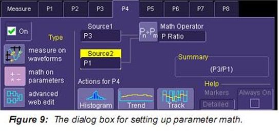 另一個關注的噪聲參數是峰值係數,峰值對有效值的比率。這個決定動態範圍的參數需要處理信號中的峰值變化。示波器沒有雙“峰”參數,但可以通過采用通道 C2的絕對值從而創建一個。將負值“翻轉”到波形的正上方以便用戶使用參數最大值讀取每個采集最大的正或負峰值。注意該處理因為信號具有0平均。使用參數數學計算峰值係數。參數數學設置如Figure 9所示,計算P3對P1的峰值係數P4。Figure 8中所示峰值係數平均值為4.3。