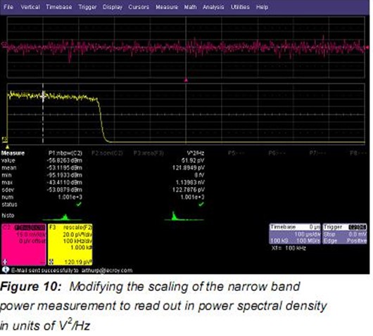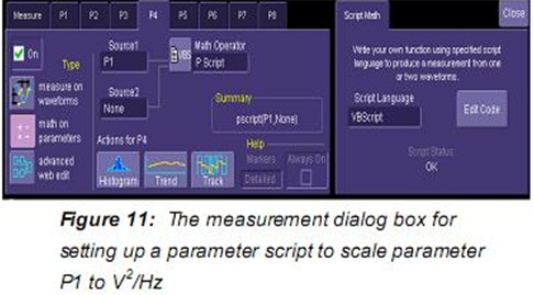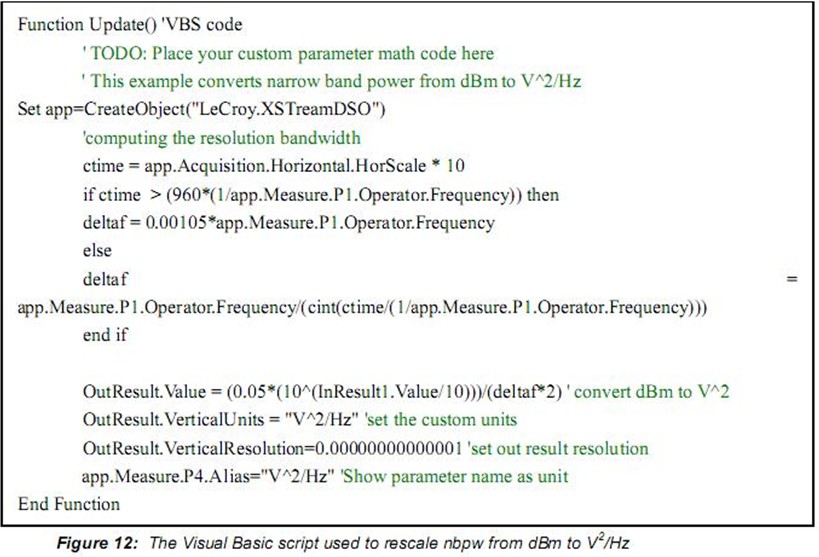 另一個進行噪聲“點”測量的方法是采用可選的窄帶功率測量。窄帶功率(nbpw)通過計算給定頻率上的離散傅裏葉變換測量功率。Nbpw的單位是dBm。噪聲測量不太方便,我們希望用噪聲功率譜密度線性單位V2√Hz來進行測量。幸運的是,力科示波器可以用腳本使用參數數學修改測量。這允許更複雜的計算而不是Figure 9所示的參數的簡單比率峰值係數。