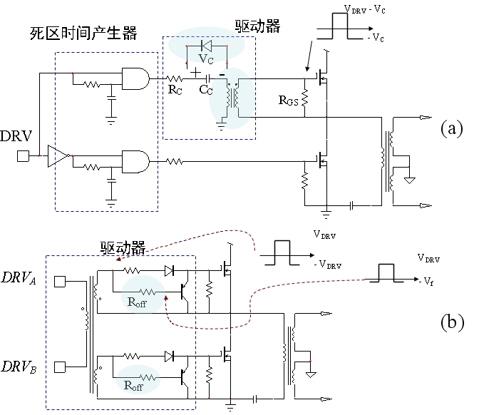 圖2b顯示的是雙極性對稱驅動輸入方案的電路圖。在這種方案中,兩個輸入(DRVA和DRVB)的極性相反,位置對稱,故不同於單驅動輸入方案,無需交流耦合電容。這種方案適合推挽型電路,如LLC-HB,但不適合非對稱電路,如非對稱半橋或有源鉗位。這種方案需要注意線路/負(fu)載(zai)瞬(shun)態(tai)時(shi)的(de)驅(qu)動(dong)變(bian)壓(ya)器(qi)磁(ci)通(tong),仍(reng)然(ran)需(xu)要(yao)強(qiang)大(da)的(de)關(guan)閉(bi)能(neng)力(li)。需(xu)要(yao)注(zhu)意(yi)由(you)泄(xie)漏(lou)電(dian)感(gan)導(dao)致(zhi)的(de)延(yan)遲(chi),將(jiang)泄(xie)漏(lou)電(dian)感(gan)減(jian)至(zhi)最(zui)小(xiao),並(bing)使(shi)用(yong)雙(shuang)輸(shu)出(chu)繞(rao)組(zu)而(er)非(fei)單(dan)輸(shu)出(chu)繞(rao)組(zu)。這(zhe)種(zhong)方(fang)案(an)的(de)另(ling)一(yi)項(xiang)不(bu)足(zu)是(shi)關(guan)閉(bi)電(dian)阻(zu)(Roff)壓降會導致額外的功率損耗。