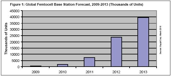 據iSuppli公司的預測,femtocell的單位出貨量今年將增長兩倍以上,從2009年的57.1萬個增長到190萬個。接下來將進入高速增長階段,2011年出貨量將達到720萬個,比2010年大增289%。2012年出貨量將銳增232%,達到2390萬個,2013年增長65.7%至3960萬個。