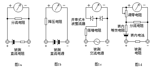 如圖1d所suo示shi,在zai表biao頭tou上shang並bing聯lian和he串chuan聯lian適shi當dang的de電dian阻zu,同tong時shi串chuan接jie一yi節jie電dian池chi,使shi電dian流liu通tong過guo被bei測ce電dian阻zu,根gen據ju電dian流liu的de大da小xiao,就jiu可ke測ce量liang出chu電dian阻zu值zhi。改gai變bian分fen流liu電dian阻zu的de阻zu值zhi,就jiu能neng改gai變bian電dian阻zu的de量liang程cheng。