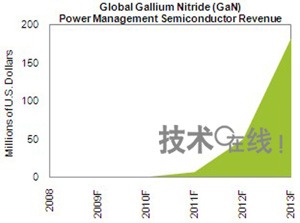 美國iSuppli公布了關於GaN(氮化镓)功率半導體市場將迅速增長的調查報告。報告顯示,2010年的市場規模近乎為零,但3年後到2013年將猛增至1.836億美元。各廠商將以替代現有功率MOSFET的方式,不斷擴大市場規模。iSuppli預測,該產品在高性能服務器、筆記本電腦、手機及有線通信設備等方麵的應用將取得進展。