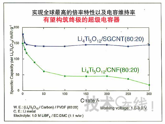 東京農工大學研究生院於2009年3月宣布,開發出了采用碳納米纖維(CNF)與LTO複合而成的負極的鋰離子電容器,與以往的采用活性炭的雙電層電容器相比,實現了約3倍的能量密度。而且還表示,將完善由日本Chemi-Con定於2011年春季樣品供貨采用該技術的鋰離子電容器的體製。