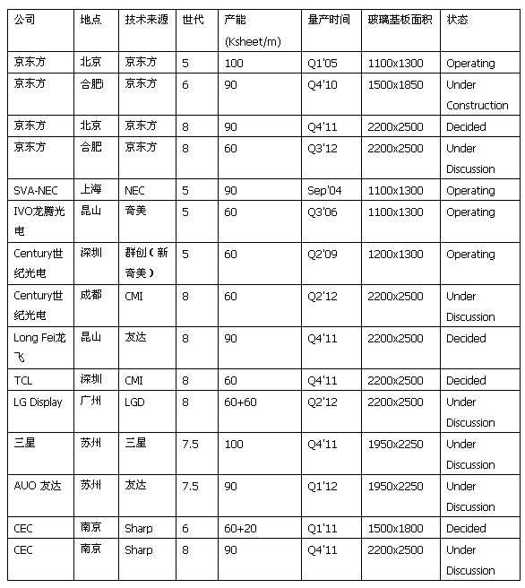 2004-2011年中國主要大尺寸TFT-LCD麵板生產線一覽