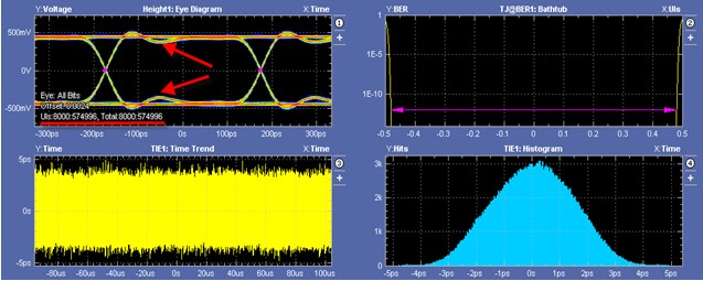 力科示波器捕獲了50MS的數據,並一次性地對所有這些數據進行眼圖測量,得到了18.73449M個比特位(UI)的眼圖。如下圖所示。