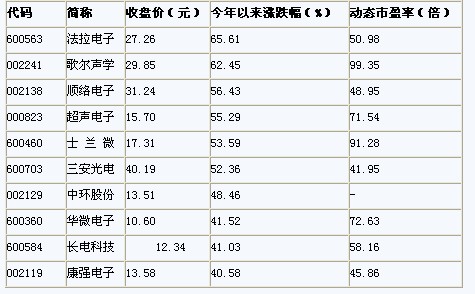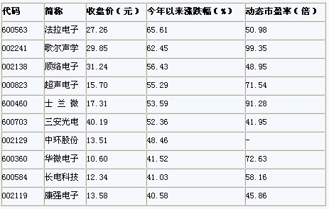 二(er)級(ji)市(shi)場(chang)的(de)表(biao)現(xian)一(yi)向(xiang)來(lai)都(dou)是(shi)先(xian)於(yu)上(shang)市(shi)公(gong)司(si)的(de)經(jing)營(ying)情(qing)況(kuang)的(de)。今(jin)年(nian)以(yi)來(lai)許(xu)多(duo)電(dian)子(zi)類(lei)公(gong)司(si)就(jiu)出(chu)現(xian)了(le)不(bu)同(tong)程(cheng)度(du)的(de)上(shang)漲(zhang),該(gai)行(xing)業(ye)的(de)今(jin)年(nian)以(yi)來(lai)算(suan)術(shu)平(ping)均(jun)漲(zhang)幅(fu)達(da)20.6%。其中今年以來漲幅最大的是法拉電子,上漲達65.61%。其次是歌爾聲學,上漲幅度達62.45%。特別注意的是隨著一季度業績的公布,這些大幅上漲的個股,由於淨利潤的同時上漲,PE也並未明顯增高。