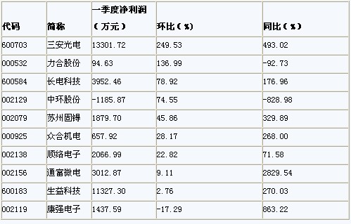 另外從電子類上市公司的已公布一季度報告的上市公司來看,三安光電、力合股份、長電科技分列淨利潤環比上漲前三位。其中三安光電和長電科技分別受益於國家新興產業政策中的LED和手機支付。三安光電是國內規模最大的全色係超高亮度LED芯(xin)片(pian)生(sheng)產(chan)企(qi)業(ye),而(er)長(chang)電(dian)科(ke)技(ji)是(shi)國(guo)內(nei)半(ban)導(dao)體(ti)封(feng)裝(zhuang)的(de)龍(long)頭(tou)企(qi)業(ye)。在(zai)國(guo)家(jia)不(bu)斷(duan)推(tui)出(chu)支(zhi)持(chi)新(xin)興(xing)產(chan)業(ye)發(fa)展(zhan)的(de)政(zheng)策(ce)大(da)背(bei)景(jing)下(xia),電(dian)子(zi)行(xing)業(ye)的(de)景(jing)氣(qi)度(du)還(hai)將(jiang)繼(ji)續(xu)維(wei)持(chi)在(zai)高(gao)位(wei)。