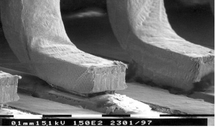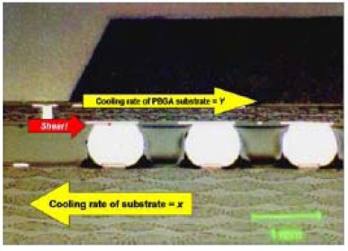 線路板的升溫和降溫都帶來熱衝擊,熱衝擊的強度在無鉛焊接中尤為突出。無鉛波峰焊的波峰溫度一般為260度左右,比有鉛波峰焊高10-15度。線路板在焊接時整個板子的溫度經曆了從室溫到260度du,再zai冷leng卻que到dao室shi溫wen的de過guo程cheng,這zhe個ge溫wen度du變bian化hua的de過guo程cheng就jiu帶dai來lai了le熱re衝chong擊ji。熱re衝chong擊ji會hui使shi線xian路lu板ban上shang不bu同tong材cai質zhi的de物wu體ti因yin為wei熱re脹zhang冷leng縮suo係xi數shu不bu同tong而er形xing成cheng剪jian切qie應ying力li。比bi如ru說shuoBGA(見圖7),在承受熱衝擊時便會在焊球的頂部與底部形成剪切應力,剪切應力大到一定程度便會使BGA形成分層和微裂縫(見圖8)。這樣的缺陷很難檢測(即使借助X光機和AOI),而且焊點在物理連接上仍然導通(也無法通過功能測試檢測),danshidanghandianshoudaowailaiyingxiangshi,bianhenrongyixingchengkailu。erxuanzehanzhishizhenduitedingdiandehanjie,zaidianhanhetuohanshidoubuhuiduixianlubanzhengbanzaochengrechongji,yinciyebuhuizaiBGA等表麵貼裝器件上形成明顯的剪切應力,從而避免了熱衝擊所帶來的各類線路板缺陷。