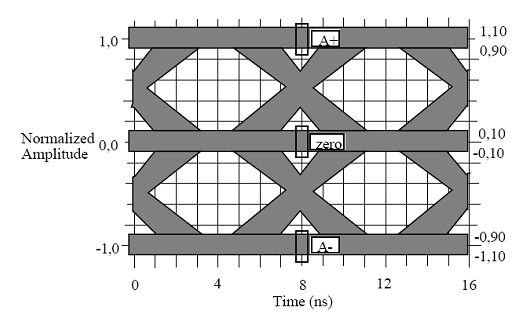 本次測試將主要驗證產品上4個以太網100Base-TX接口的技術指標。對於其中比較直觀的100Base-TX物理層的眼圖模板,《ANSI+X3_263-1995》標準中有著明確的眼圖模板定義見圖2。