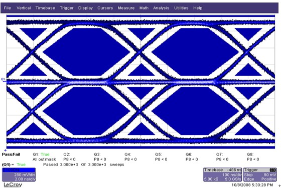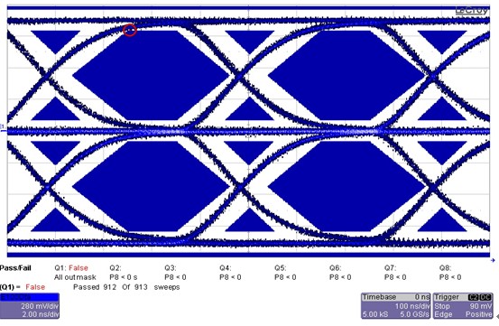經過研發與測試工程師的討論,在目前不改動係統設計的前提下,采用微調RDAC電阻的方法來增大信號輸出電平幅度以解決信號眼圖的問題。經過調整後,眼圖測試通過,波形見圖6。