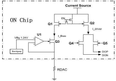 係統設計人員都知道,以太網收發器的輸出采用的是差分電流驅動,從收發器驅動偏置原理框圖,見圖5,可以進一步展開分析,收發器驅動電流可以通過帶隙電壓源與外部設定基準的比較來設定。收發器驅動電流(I_driver) 是從內部帶隙和外部基準鏡像過來。U1/Q3/RDAC/Bandgap組成了一個簡單的比較控製環路實現基準單位電流的設定,例如帶隙基準電壓設定為Vbg=1.24V,RDAC取值為1.24K。這時通過比較器U1以及MOS管Q3反饋環路是確保穩定1mA(I_bias)的基準電流。而Q1/Q2/Current _Source組成了比例鏡像電流源。可以通過設計保證I_driver=N*I_bias,N是設定的比例鏡像因子。我們假定為20,通過公式可以計算I_driver=20*I_bias=20mA,這就是我們差分驅動的輸出電流了。介紹到這裏,大家都應該清楚了,我們可以通過調整RDAC的電阻大小實現基準單位電流的設定,進而達到調整差分驅動電流的目的。例如我們將RDAC調整為1K,則基準單位電流則變為I_Bias=1.24mA,同步的I_driver變為20*1.24mA=24.8mA,輸出信號電平的幅度也會增大。實際的調測結果也是這樣,可以解決信號邊沿碰觸模板的問題。