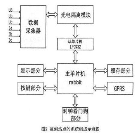 監測站點由前端數據采集器和現場下位機構成,其中前端數據采集器采用CS5460模塊和LPC932單片機構成,它負責采集監控現場的各項數據並存儲。線路的內部經過嚴格的電磁隔離,測量電路經過采樣、A/D轉換處理後形成的數字信號再經過光電耦合由信號適配器向從單片機LPC932傳送,主單片機與從單片機之間可采用I/O口模擬時序的方式進行串口通信。