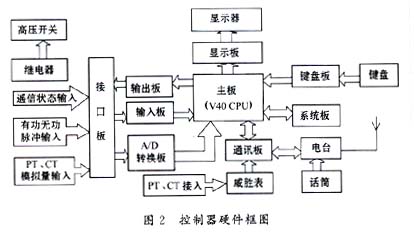 該終端控製器的硬件結構如圖2所示,它的主體是一台STD工控機,采用模板式結構,便於故障檢修。供電線路的電壓、電流經PT、CT變換後經A/D轉換板轉變為數字信號送至V40主板,PT、CT變比經主台設定後下發至該終端,CPU據此計算出線路的實際電壓、電流。脈衝電度表發出的脈衝信號經輸入板送至CPU,根據電表脈衝常數計算出有功及無功功率。KG105型電台接收主台下發的指令,經通訊板送至CPU,ranhouyoushuchubankongzhishuchujidianqidedongzuo,jinershixianyaokongtiaohezhacaozuo。yuanchengchaobiaoshiyoudiantaijingtongxunbancaijiweishengbiaozhongdeshujushixiande,erzhaoceshujuzeshicaijiCPU中計算出的數據。CPU每隔1min采集1次數據,所有計算結果保存在係統板上的SRAM中,可保存24小時的數據,因此主台第二天必須將第一天的數據召測回中心站的數據庫中,否則第一天的數據將丟失。