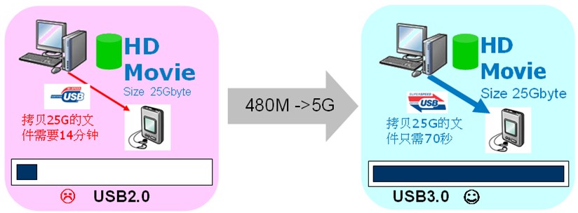 盡管USB2.0的速度已經相當快,對於目前高清視頻和TB級別的數據傳輸還是有些慢,在2008年11月,HP、Intel、微軟、NEC、ST-NXP、TI聯合起來正式發布了USB3.0的V1.0規範。USB3.0又稱為Super Speed USB,比特率高達5Gbps,相比目前USB2.0的480Mbps的速率,提高了10倍以上,引用Intel專家Jeff Ravencraft的話:“以25GB的文件傳輸為例,USB2.0需要14分鍾,而3.0隻需70秒左右(如圖1所示)。”25GB,正好是單麵單層藍光光盤的容量。USB3.0預計將在2011年逐漸在計算機和消費電子產品上使用。