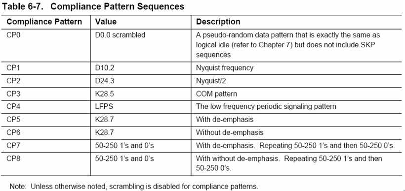 在USB3.0規範中定義了多種兼容性測試碼型(Compliance Pattern,簡稱CP),如下圖4所示包括了CP0-CP8九種測試碼型。在TX測量中,需要用到CP0/CP1/CP7/CP8四種碼型:CP0用於眼圖與抖動、共模電壓測量;CP1用於SSC展頻測量、隨機抖動測量;CP7用於去加重測量;CP8用於差分電壓幅度測量。