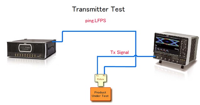 在TX測試時,信號的傳輸鏈路如圖7的上半部分所示,力科示波器通過USB電纜控製PeRT3,PeRT3通過同軸電纜向PUT的RX端發送Ping.LFPS,PUT的TX連接到示波器的通道。PeRT每發送一次Ping.LFPS,則PUT的TX發送的碼型在CP0到CP8之間切換一次(比如從CP0變為CP1,或從CP8變為CP0),這樣無需測試人員去配置PUT發送不同的測試碼型了,通過PeRT3,力科的QualiPHY軟件會自動控製PUT發送不同的測試碼型,完成TX的所有測試。