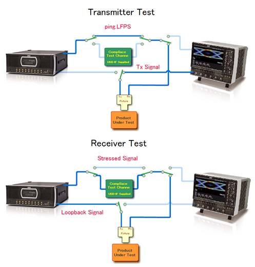 在RX測試時,示波器通過GPIB接口控製RF Switch切換到另一鏈路,如圖7下部分所示,PeRT3的碼型發生器輸出的加入抖動的信號先通過Compliance Test Channel(由Intel的11英寸背板和3米USB3.0電纜組成),然後連接到USB3夾具,進入PUT的RX端,PUT的TX端通過夾具,把信號發送給PeRT3的Error Dector端。