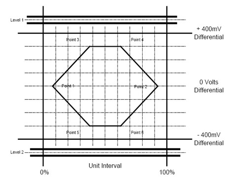 本次測試將主要驗證產品上兩個USB高速主機接口的眼圖。對於USB2.0物理層的眼圖測試,USB IF在USB2.0 SPEC中有著明確的眼圖模板定義如下: