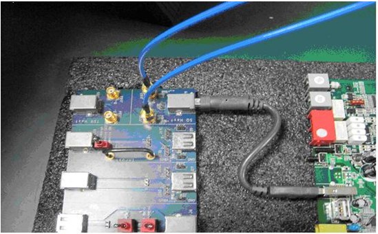 關於USB高速主機眼圖測試的測試方法,USB IF在USB2.0 SPEC中也有清晰的定義,USB2.0主機控製器必須支持規定的測試模式。對於眼圖的測試則必須支持Test Packet測試模式,連續發送規範的測試碼流以測定眼圖模板,上升下降時間,傳輸抖動以及其他的一些AC指標。也就是說測試是基於原廠對於測試模式的支持並提供相應的Firmware。準備測試前工程師和原廠溝通後順利拿到了測試Firmware和測試命令。原廠提供的測試方法是在上電啟動之後進入CFE模式然後下載和運行測試專用Image,這樣就可以使用Test_Packet命令進行眼圖的測試了。測試連接圖示如下: